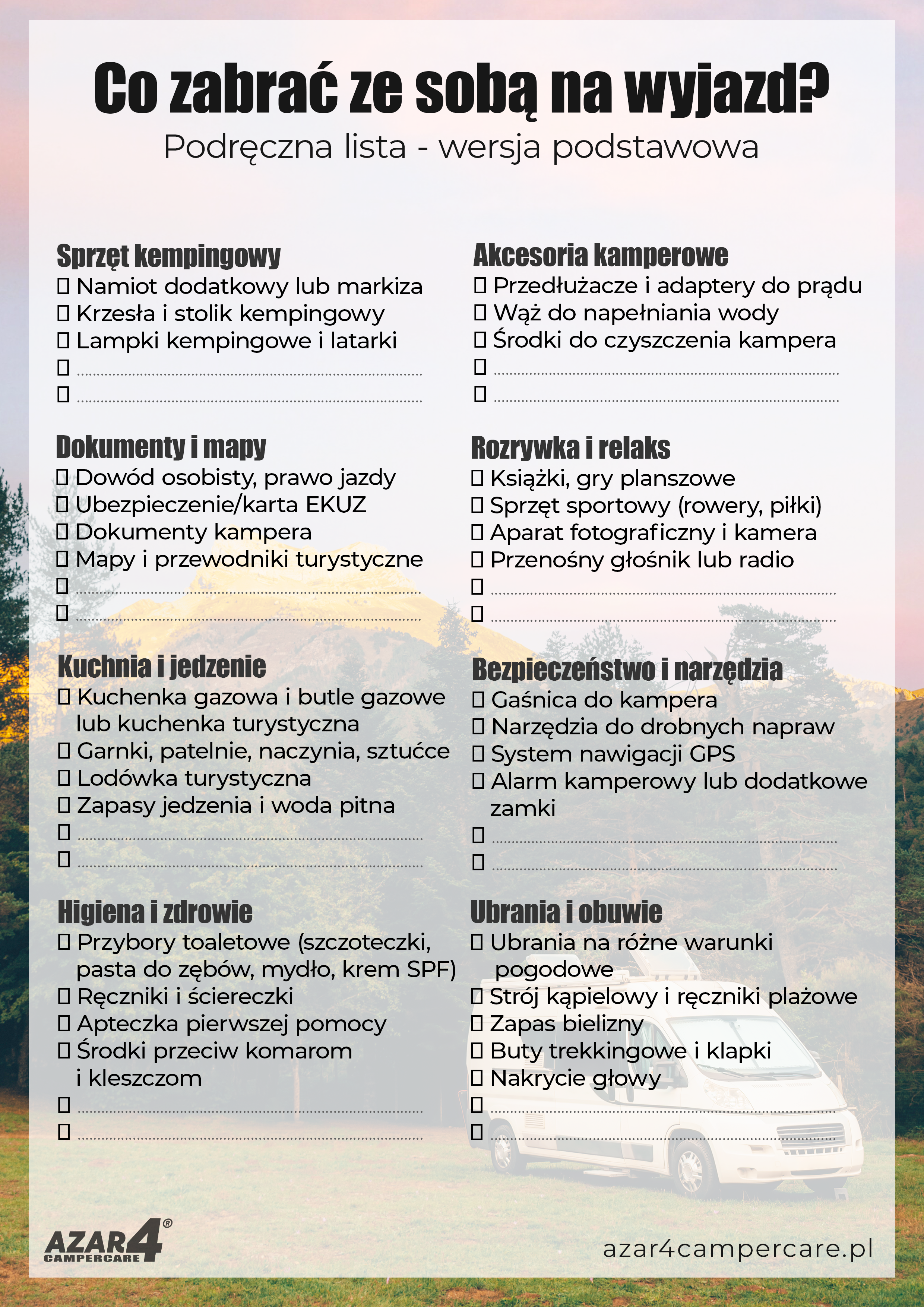 Planujecie letnią podróż kamperem? Odpowiednie przygotowanie do kempingu to klucz do udanej i bezstresowej wyprawy. Pytacie się, co spakować na wyjazd? Oto kompleksowy przewodnik, co warto zabrać ze sobą na wycieczkę, aby w pełni cieszyć się wakacyjną przygodą.