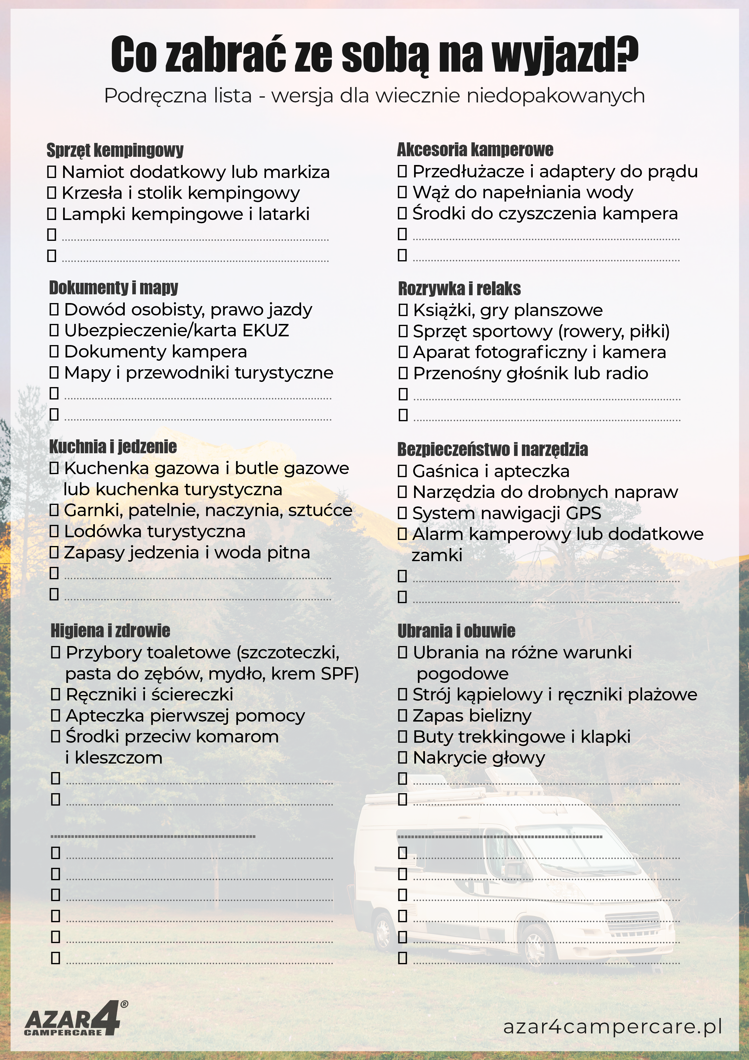 - Środki do czyszczenia kampera: Utrzymają wnętrze w czystości podczas wyjazdu, co z pewnością wpłynie na komfort podróży.
