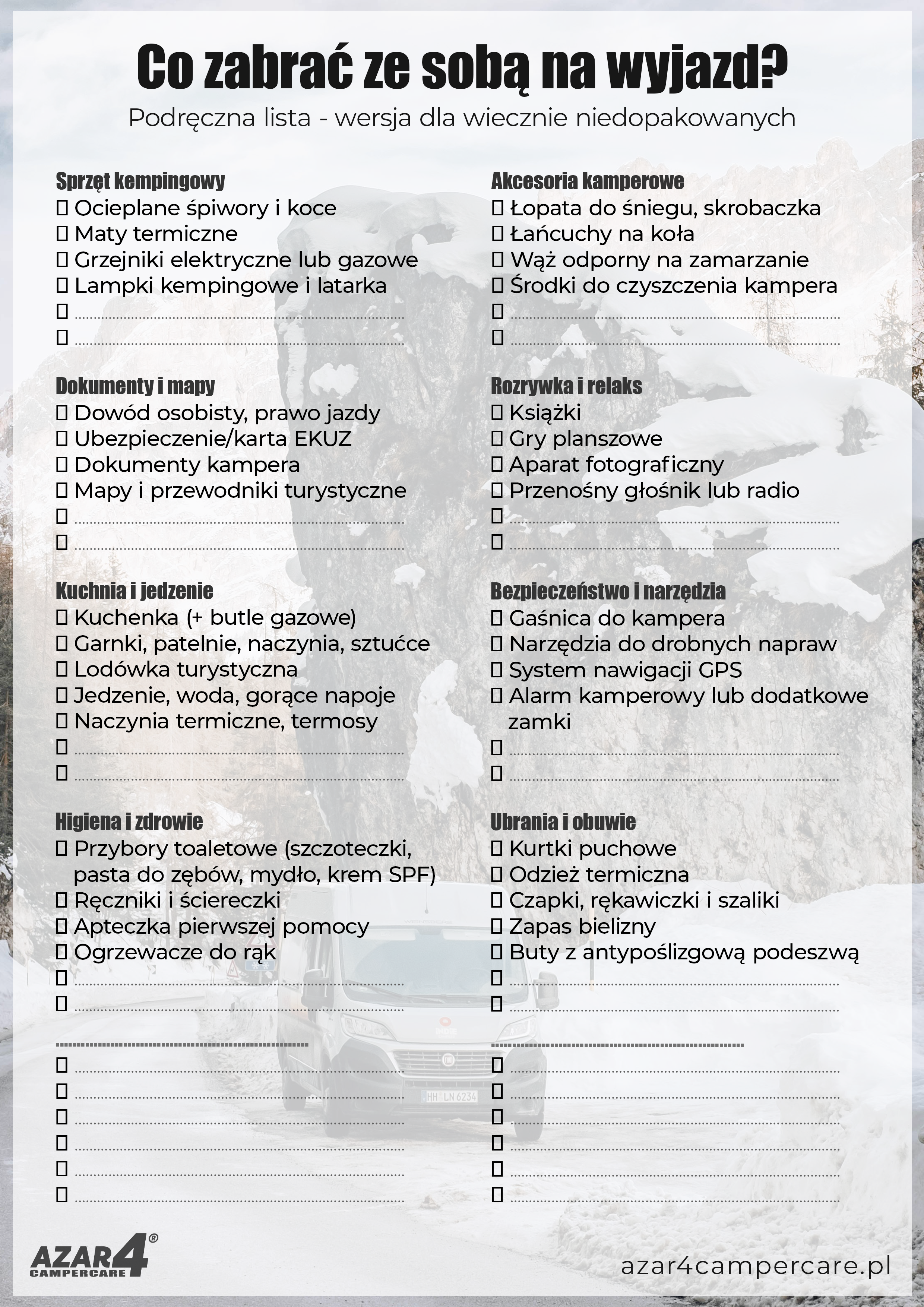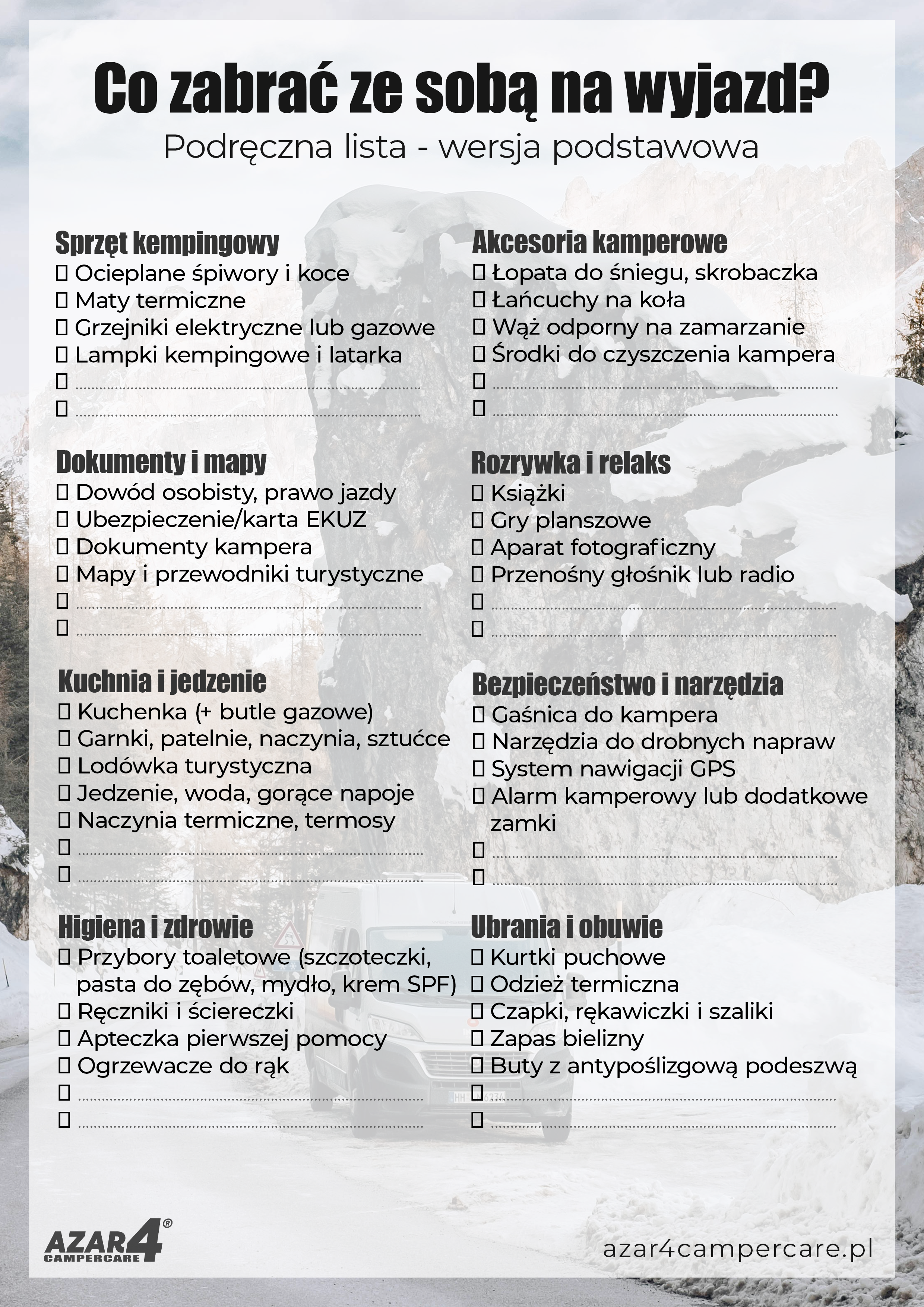 Zimowa podróż kamperem to wyjątkowe doświadczenie, które pozwala na odkrywanie uroków zimowych krajobrazów z wygodą mobilnego domu. Aby podróż była komfortowa i bezpieczna, warto odpowiednio się przygotować. Oto lista rzeczy, które warto zabrać ze sobą podczas zimowych wyjazdów kamperem:
